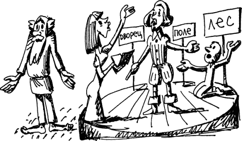– Ребята, вот история, давайте вместе разовьем ее в спектакль. Не будем мелочиться: воткнем в сцену палку, на табличке напишем «лес», на другой – «замок». Пусть зритель досочинит, довообразит.
