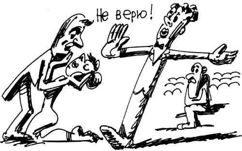 Схема действительно груба. А нужно, чтобы не только простаки, но и самые взыскательные зрители поверили всему, увидели свет истины и пали на колени с криком: «Грешен! Прости меня, Господи!»
