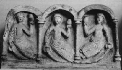 Рис. 5. Рельеф на священном «источнике Ковентины», фигуры кельтских богинь судьбы, которые, в отличие от парок и мойр, не прядут нити, а льют священную влагу. Британия, II в. до н. э.