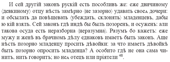 Обычай навязывать невесту зафиксирован уже в 1663 г. в «Русском законе» автора «Записки Юрия Крижанича о миссии в Москву 1641 г.», который два раза был в России и провел около 15 лет в качестве ссыльного в Тобольске:[79]