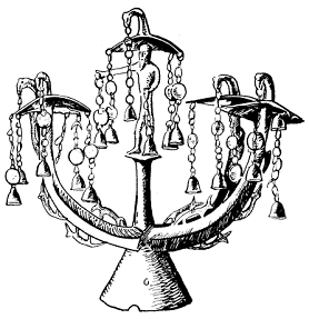 Сам мотив четырехугольной страны проясняется в свете функциональной характеристики, присущей Таргитаю как владыке телесного мира и как персонажу, рождение которого знаменует формирование упорядоченной, организованной вселенной. Равносторонний четырехугольник есть простейшая модель организованного мира [57]. Эта модель находит выражение в общераспространенных представлениях о четырех сторонах света, хорошо известных, например, древнеиндийской традиции [см. Kirfel 1920: 17*, 19*, 10 – 11]. С тем же мотивом связаны и локапалы индийской мифологии – хранители мира, которых первоначально было именно четыре и которые соотносились с главными странами света; лишь позднее число их возросло до восьми за счет включения промежуточных направлений горизонта [Sircar 1972; Васильков 1974: 151 – 155]. О том, что концепция четырех сторон света была присуща скифскому пониманию мира, говорит и форма известного навершия с Лысой горы (рис. 7), четыре рожка которого, украшенные фигурками животных (вол-ков?), по убедительному толкованию Б. Н. Гракова [1971: 83], «символизируют степь и землю с четырьмя сторонами света». Приведенные данные, как представляется, позволяют утверждать, что Геродот попытался приложить к реальной карте Скифии своего времени мифологическую по происхождению характеристику, возникшую значительно ранее и скорее всего в иных географических условиях. В то же время сходство описания родины Таргитая Скифии и характеристики страны, где родился Траетаона, служит дополнительным аргументом в пользу отождествления этих персонажей.