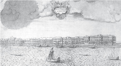 Набережная левого берега Невы у дворца Ф. М. Апраксина. Рисунок Х. Марселиуса. 1725 г.