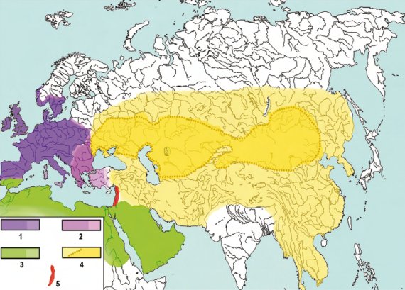 Примечание: границы ареалов отображены на карте намеренно расплывчато, что соответствовало исторической реальности; в центре ареала Монгольской империи различаются контуры Степного пояса