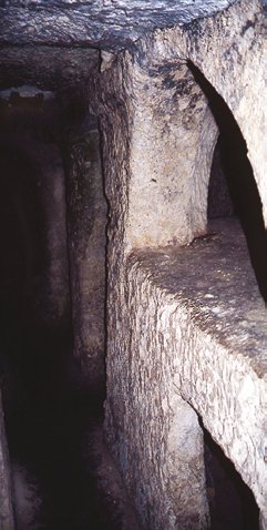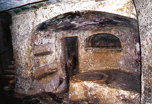 Рис. Про. 2.1. Катакомбы ранних христиан на Мальте. Алтарная часть подземной церкви, где возносили свои молитвы (левое фото), и погребали единоверцев (правое фото). Массу подобных катакомб сооружали в начале христанской эры также вокруг Рима