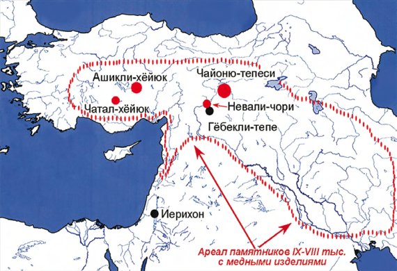 Самые ранние из ныне известных на Земле металлических изделий, произведенных руками человека, стали известны в памятниках Анатолии, Леванта, Северной Месопотамии и Западного Ирана. Эти медные предметы залегали в слоях, время которых уходит еще в IX, а возможно даже и в X тысячелетия до нашей эры, и эта дата не может не показаться воистину фантастической. Памятники, в которых были обнаружены эти в целом пока что мало выразительные медные вещицы, традиционно относят к самым ранним ступеням новокаменного века, то есть еще к неолиту. Вместе с тем «неолит» этих краев оказался весьма необычным. По устоявшейся в археологии традиции к новокаменной эпохе обычно причисляют памятники, слои которых содержат обожженную глиняную посуду. В тех же поселениях ее не оказалось, исключая, пожалуй, самые поздние этапы их существования. Поэтому чаще всего об этих древностях говорят как о докерамическом неолите. Зато выявились черты совершенно неожиданные: кроме меди здесь стали заметными очевидные признаки начала земледелия, а несколько позднее и скотоводства.