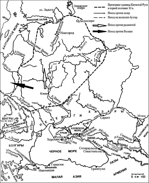 Догадываясь о причине этой путаницы, С.М. Соловьев поостерегся отвергнуть свидетельство одних источников, дабы отдать безусловное предпочтение другим. «Вероятно, – предполагал он, – были походы и к тем и к другим (болгарам. – С. ц.) и после перемешаны по одинаковости народного имени»[79]. Того же мнения придерживался В.В. Мавродин, писавший, что в летописном рассказе о болгарах отразились, слившись друг с другом, два разных похода Владимира – к болгарам волжским и болгарам дунайским[80]. Я думаю, что эта точка зрения решает проблему наиболее удовлетворительным образом. Ниже мы увидим, какие доводы имеются в пользу походов Владимира на Дунай, а пока что рассмотрим аргументы, говорящие за то, что и Волжская Булгария входила в число стран и земель, затронутых завоевательной политикой Владимира.