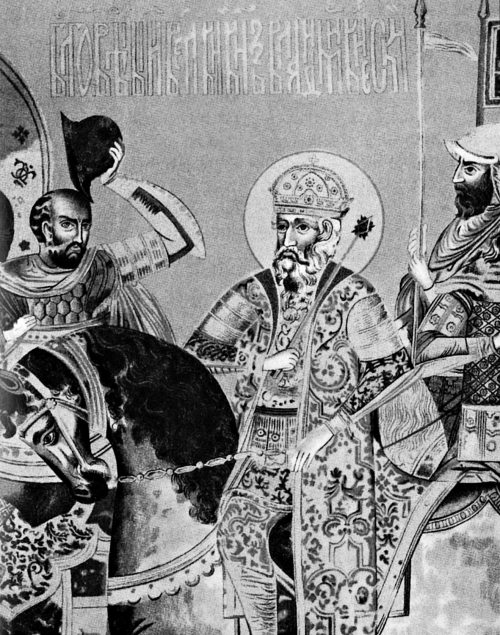 Изображение великого князя Владимира Святославича на древнем знамени. Реконструкция. Художник Ф. Солнцев. XIX в.