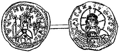 Еще более красноречив древнерусский нумизматический материал Владимировой эпохи. На золотых и серебряных монетах (так называемых сребрениках I типа), отчеканенных в Киеве в конце X – начале XI в., Владимир изображен в императорском облачении – длинной рубахе с узорчатой полосой и длинном плаще, скрепленном у правого плеча драгоценной застежкой-фибулой, со знаками царской власти – венцом и скипетром, и с нимбом над головой – символом царского величия.