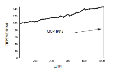 На рисунке 1 представлен прототипический случай проблемы индукции в том виде, в каком она встречается в реальной жизни. Вы наблюдаете за поведением гипотетической переменной тысячу дней. Это может быть что угодно (с небольшими видоизменениями): продажи книги, артериальное давление, преступления, ваш доход, акции компании, проценты по кредиту, количество воскресных прихожан в конкретном приходе Греческой православной церкви. Далее, на основании только накопленных данных вы делаете какие-то выводы о тенденциях и прогноз на следующую тысячу дней, а то и на пять тысяч. На тысяча первый день – бабах! – происходит существенный перелом, никак не подготовленный событиями прошлого.