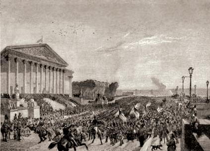Первыми свой протест высказали журналисты и печатники, потерявшие работу из-за этих ордонансов. Их протест получил массовую поддержку. На улицах собрались толпы возмущенного люда, которые уже 27 июля стали вооружаться и строить баррикады. Спустя два дня Париж полностью оказался во власти повстанцев. Карл X, пребывавший вместе с семьей сначала в замке Сен-Клу, затем – в Рамбуйе, не отдавал себе отчета в происходившем. Прежний опыт – в молодости он был свидетелем восстания 14 июля 1789 года в Париже – его, к сожалению, ничему не научил. Лишь в ночь с 29 на 30 июля он наконец дал согласие на отставку правительства Полиньяка и отмену ордонансов. Но деятели либеральной оппозиции, верховодившие в Париже, попросту отмахнулись от него.