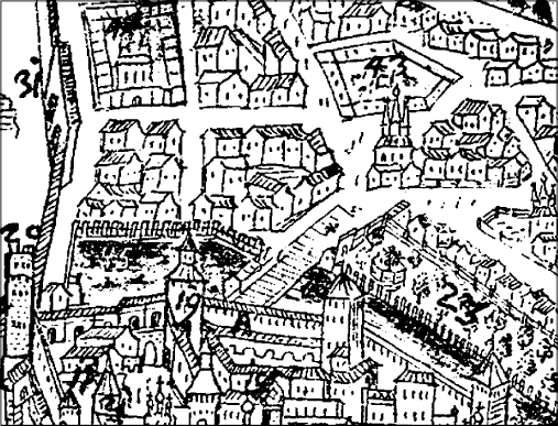На плане Мейерберга 1661 г. Лебяжий пруд (№ 45) у Боровицкой башни (№ 19)