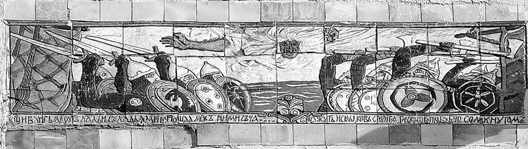 В ней повествуется о крестовом походе немецких князей и викингов Свена и Кнута, предпринятом с благословения папы римского Евгения III против балтийских славян. Боривой – вымышленное имя славянского вождя, нанесшего сокрушительное поражение крестоносцам в решительной битве (курсивом выделены строки, помещенные на майоликах):