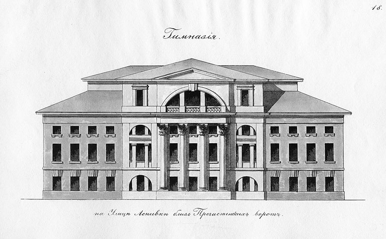 Во время приезда в Москву императрицы Екатерины II в 1775 г. на празднование заключения Кючук-Кайнарджийского мира с Турцией все окружающие дома были либо сняты, либо куплены в казну для размещения многочисленного двора (тогда Кремлевский дворец перестраивался Баженовым, а Головинский дворец незадолго перед тем сгорел). Так был приобретен и дом на углу Большого Знаменского переулка, в котором поместился цесаревич Павел. В том же году Екатерина пожаловала дом генерал-фельдмаршалу П.А. Румянцеву-Задунайскому, который после пожара, происшедшего через 13 лет, продал его. В конце XVIII в. дом, принадлежавший тогда бригадиру Ф.А. Лопухину, предназначался под казармы, а в начале XIX в. переделывался для «приему азиатских посланников». В 1804 г. дом был продан университету для «главного народного училища» и его опять переделывали (в этом участвовал архитектор М.Ф. Казаков). В 1810 г. дом сгорел и стоял неотделанным, а в 1812 г. он опять пострадал от пожара, и только в мае 1819 г. в нем открылась губернская гимназия, ставшая 1-й московской.
