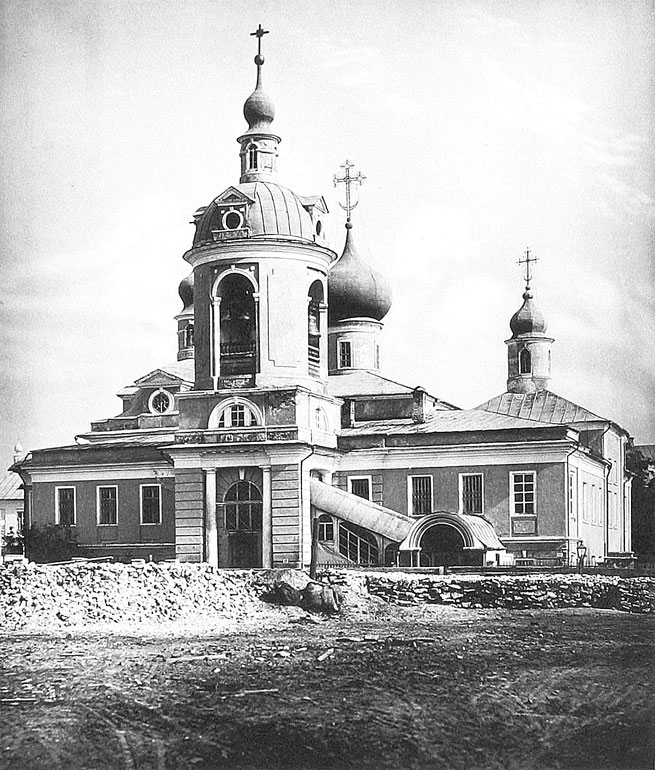 Два Знаменских переулка, параллельные друг другу, пересекает под прямым углом Колымажный переулок, идущий от Волхонки до Гоголевского бульвара. В XVII в. часть переулка, ближайшая к бульвару, называлась Лукинским – по церкви св. евангелиста Луки, находившейся примерно на месте здания Министерства обороны, а другая часть переулка, ближе к Волхонке, называлась, по мнению авторитетного историка XIX в. А.А. Мартынова, Колымажным – по Колымажному двору, где сейчас музей. Весь же переулок до 1962 г. носил название Антипьевского (по церкви), а в 1962–1992 гг. его назвали улицей Маршала Шапошникова, военного теоретика и практика, долгие годы бывшего начальником Генерального штаба Советской армии. В 1992 г. в процессе восстановления нашей истории улица опять стала привычным переулком, но теперь ему дано старинное имя – Колымажный. Церковь, здание которой стоит на углу с Малым Знаменским переулком, освящена в память священномученика Антипия, епископа Пергамского, который славился исцелениями (особенно он был популярен среди страдающих зубной болью). Время построения этой церкви неизвестно, но, вероятно, она появилась здесь после «великого пожара» 1547 г., когда сюда перевели великокняжеские конюшни, ранее находившиеся в Кремле. Церковь называлась «что у государевых больших конюшен», «на Ленивом торжку у старых конюшен» или «что в Чертолье». Церковь была исследована и отреставрирована архитектором Л.А. Давидом, который обнаружил в ее составе уникальное сооружение, о котором ранее ничего не было известно. Центральное ядро церковного строения, как оказалось, составляет здание с двумя, что было чрезвычайно редко, апсидами. С южной стороны находился Никольский придел, впервые пристроенный в XVII в. вместо галереи, опоясывавшей церковь, и замененный ныне существующим в 1739–1741 гг. по прошению князя С.А. Голицына (он в 1755 г. был московским губернатором). С северной стороны – придел св. Иоанна Предтечи, который, как и трапезная с колокольней, был выстроен в 1798 г. Две апсиды первоначального объема церкви хорошо видны со двора – большая апсида отмечает главный Антипьевский престол, а меньшая – придельный св. Григория Декаполита. Посвящение придела этому святому, может быть, обязано тому, что храмоздателем мог быть Григорий Яковлевич Плещеев-Бельский, более известный как Малюта Скуратов, опричник Ивана Грозного. Известно, что в Антипьевской церкви в 1628 г. патриарх совершал отпевание его родственника (правнука его брата) Дмитрия Скуратова, возможно имевшего усадьбу рядом с церковью. По книге 1657 г. возле церкви находился двор «Петра Дмитриева сына Скуратова». Храм св. Антипия закрыли в 1929 г. – в августе этого года газета «Вечерняя Москва» сообщала, что церковь «будет предоставлена Неофилологической библиотеке». До последнего времени помещение храма было занято Музеем изобразительных искусств. Церковный участок полукольцом охватывает территория бывшей усадьбы Милославских XVIII в. (№ 6). Ее главный дом не сохранился, и примерно на его месте находится деревянный ампирный особняк, построенный после пожара 1812 г. действительным статским советником П.И. Глебовым, знакомым семьи Пушкиных, крестным отцом их третьего сына – Льва, родившегося 9 апреля 1805 г. Позади дома Глебова осталось хозяйственное строение, возможно, еще XVIII в., другое же строение, справа, появилось в 1820 г.
