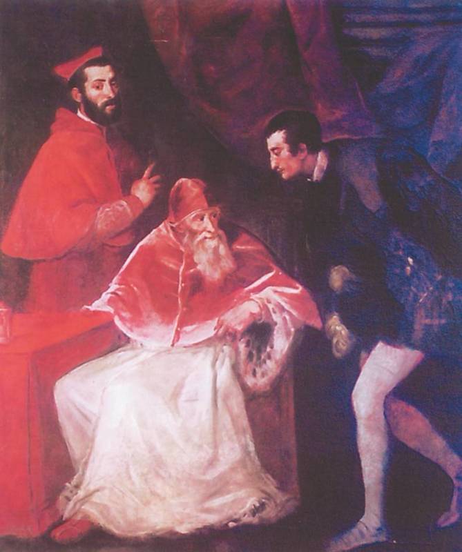 Стоит особо отметить полотно «Портрет Папы Павла III с Алессандро и Оттавио Фарнезе», по композиционному решению сходное с «Портретом Папы Льва X с кардиналами Джулио Медичи и Луиджи Росси», написанным Рафаэлем. Но по своей манере работа Тициана мало похожа на проникнутую спокойствием картину Рафаэля.
