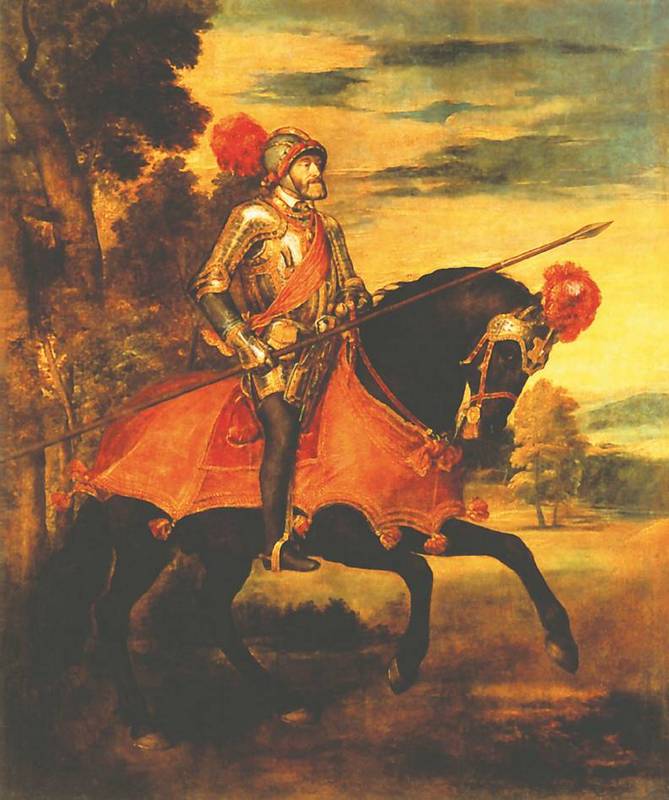 Иным предстает император на портрете «Карл V под Мюльбергом». На фоне пейзажа, озаренного рассветными лучами, на коне восседает Карл, облаченный в сверкающие металлические доспехи. В его руках – копье, в глазах отражена решимость и отвага воина, готового обрушить на врага весь свой гнев.