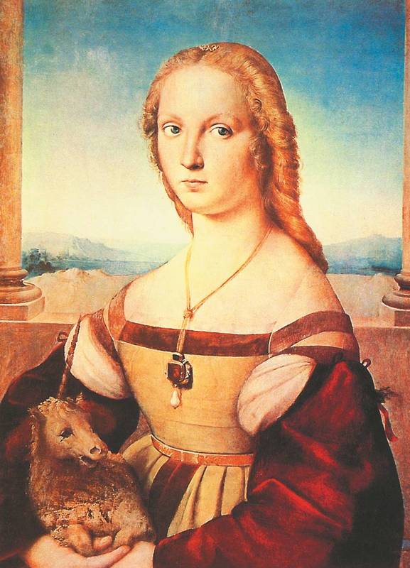 Драматична и история «Портрета женщины с единорогом». Картина несколько раз дописывалась и изменялась и однажды даже превратилась в изображение св. Екатерины Александрийской, а на месте единорога появилось колесо – орудие пыток. Когда композиция приобрела свой первоначальный вид, исследователи выяснили, что ее автор – Рафаэль.