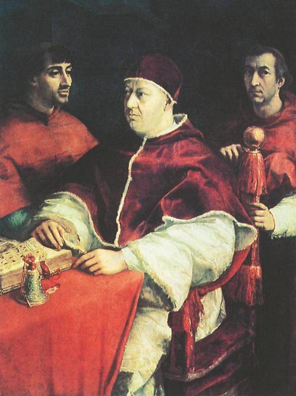 Рафаэль. «Портрет Папы Льва X с кардиналами Джулио Медичи и Луиджи Росси», 1518, галерея Уффици, Флоренция
