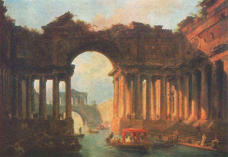 Французский художник Юбер Робер родился в Париже. В 1754 году, решив стать живописцем, он переехал в Рим и поступил в обучение к Дж. Паннини. В свободное время Юбер совершал прогулки по улицам города и делал зарисовки понравившихся ему видов. Вскоре он познакомился с Ж. О. Фрагонаром. Художники вместе рисовали архитектурные пейзажи. Сохранились виды виллы д’Эсте, которые они выполняли сангиной (сегодня эти рисунки хранятся в Лувре). В 1765 году Робер вернулся в Париж. Через два года он показал в Салоне несколько архитектурных пейзажей, в том числе «Римский порт» (1766, Музей школы изящных искусств, Париж). Отклики на эти работы были положительными, так как в Париже в те годы многие были увлечены античностью: архитектурой, скульптурой, литературой, легендами и т. д. Именно поэтому картины Робера были приняты с восхищением и в течение последующих десяти лет прекрасно раскупались. Среди многочисленных произведений того периода можно выделить «Руины с обелиском в глубине» (1775, ГМИИ, Москва), «Саркофаг» (1776, ГМИИ, Москва), «Архитектурный пейзаж с каналом» (Эрмитаж, Санкт-Петербург). Интересен также пейзаж «Пирамида Цестия» (Эрмитаж, Санкт-Петербург), на котором мастер изобразил гробницу римского плебейского трибуна, построенную в начале I века до н. э. в окрестностях Рима.