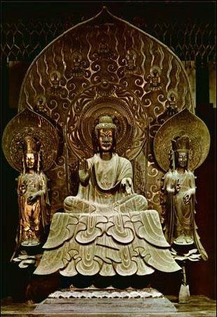 Буддизм в Японии появляется и становится одной из основных религий, как третья часть «Трех учений» воспринятых из китайской культуры. Большую роль в утверждении буддизма в стране сыграл мыслитель, поэт, каллиграф Ку-кай (773–835) – фигура огромной значимости для японской культуры. Он написал текст; который назвал «Санго. сиики», что означает: «Три учения указывают направляют», в котором японский ученый в литературной форме дает возможность читателю сравнить положения «Трех учений», вложив их в уста своих героев – конфуцианца, даоса и буддиста. Внимая речам буддийского монаха, все слушающие, включая даоса и конфуцианца, были настолько потрясены убедительностью буддийского учения, что решительно обратились к нему.[174] Ку-кай в основу составления «Санго: сиики» положил конфуцианские, даосские, буддийские источники, использовал логическое обоснование для доказательства преимущества буддизма над двумя другими учениями. Ку-кай прославился как патриарх и основатель буддийской школы Сингон в Японии.