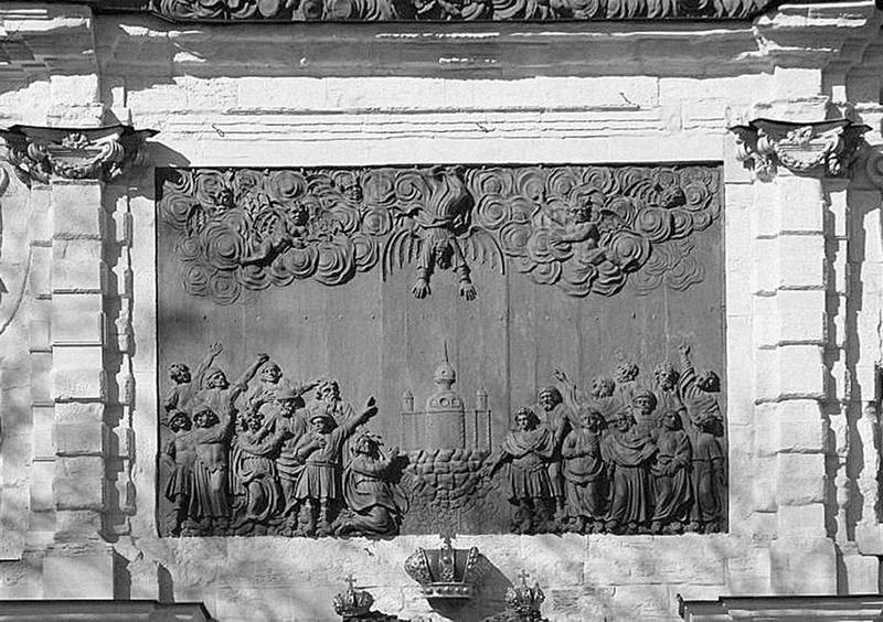 Эти ворота мы видим и сейчас при входе в крепость. При всей своей монументальности они не выглядят тяжеловесными. Они величавы. Их украшают горельефы со странными, непонятными, на первый взгляд, сюжетами. В Петровскую эпоху эти сюжеты читались столь же легко, как сегодня читаются комиксы. Только вот значимость изображений на горельефах неизмеримо богаче незатейливых рисунков. Верхняя часть ворот выделена аттиком с лучковым фронтоном. Чаще всего встречаются треугольные фронтоны, но здесь мы видим лучковый фронтон, в котором помещён горельеф с изображением бога Саваофа, держащего в руке сферу – символ вселенской власти.