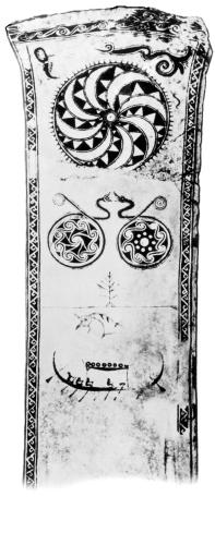 На этом памятном камне IV–V веков с острова Готланд изображен вариант «картины мира» как ее представляли древние скандинавы: мировое древо с солнечными символами. В верхней части большой солнечный диск, в центре два малых диска, вокруг которых обвились драконы, они обозначают движение светила в пространстве и времени. В нижней части изображен корабль мертвых – ладья, которая перевозит их в загробный мир через воды мирового океана