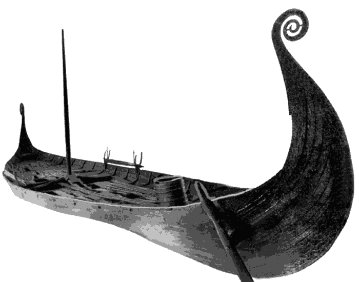 Именно на такой ладье, сохранившейся до наших дней, отправлялись мертвые, по представлениям древних, в мир иной. Погребальная ладья норвежской королевы Осы