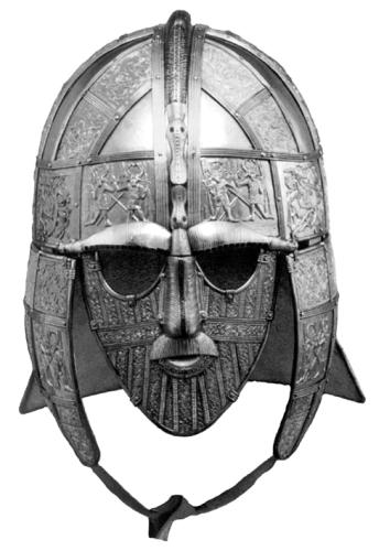 Шлем из королевского погребения в Саттон-Ху в Англии. На серебряных пластинах изображены ритуальные воинские танцы