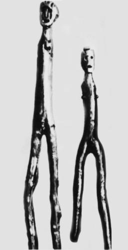Мужская и женская деревянные фигурки из святилища в Шлезвиге. Ранний железный век