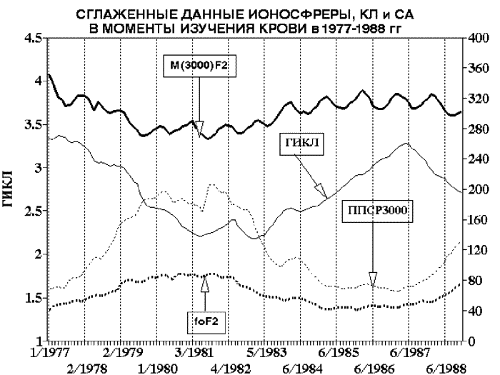 Рис. 1.3. 12-летняя динамика (с 1977 по 1988 г.) двух ионосферных показателей: критической частоты f0F2 слоя F2 и коэффициента М(3000)F2 ионосферы, а также плотности потока солнечного радиоизлучения на частоте 3000 Мгц (ППСР3000) и глобальной интенсивности космических излучений (ГИКЛ) – в моменты исследования гематологических признаков циркулирующей крови. Наглядно представлены 11-летние тренды космических и ионосферных параметров наряду с квазипериодическими нерегулярными флуктуациями