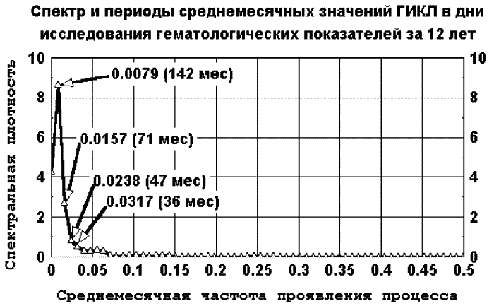 Рис. 2.1. 1/f-подобный спектр и периоды среднемесячных значений ГИКЛ в дни исследования гематологических параметров в период с 1977 по 1988 г. Здесь частота f соответствует около 11-летнему циклу (142 мес.)