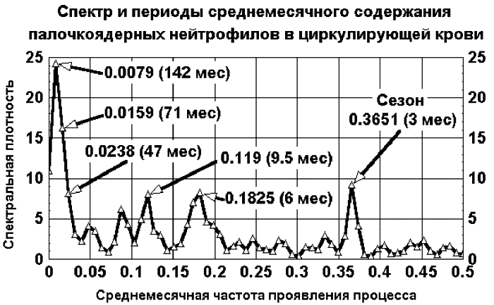 Рис. 2.2. Спектр и периоды среднемесячных значений содержания палочкоядерных нейтрофилов в циркулирующей крови в утренние часы в период с 1977 по 1988 г. наглядно демонстрируют, что долгосрочные периоды и спектры совпадают с показателями ГИКЛ и, следовательно, имеют 1/f – подобные закономерности