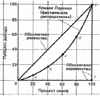 Если бы доходы распределялись равномерно, то есть 10 % получателей имели бы десятую часть доходов, 50 % – половину и т. д., то такое распределение имело бы вид линии равномерного распределения (диагонали квадрата со сторонами от 0 до 100 %). При неравномерном распределении «линия концентрации» представляет собой выгнутую вниз кривую. Чем дальше кривая Лоренца отстоит от прямой линии равномерного распределения, тем больше дифференциация. Коэффициент Джини рассчитывается как отношение площади сегмента, образуемого кривой Лоренца и линией равномерного распределения, к площади треугольника ниже линии равномерного распределения.