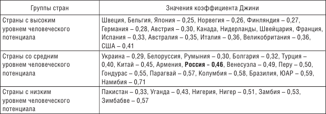 По данным ООН [97], в 2004 г. коэффициент Джини имел следующие значения по группам стран с разным уровнем развития человеческого потенциала (табл. 1.2).