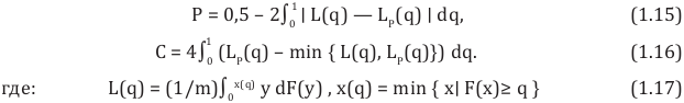 Дополнительные разложения индекса Джини, а также нормального и избыточного неравенства были введены А. Кирутой [38] в 2003 г. Индекс поляризации и соответствующий индекс концентрации зарплат в терминах кривых Лоренца определяются формулами: