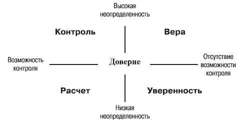 Большинство из рассмотренных понятий, близких к доверию, можно расположить в пространстве двух факторов, описывающих ситуацию взаимодействия партнеров: возможность контроля и наличие неопределенности. Это позволяет графически отобразить место доверия в системе наиболее близких к нему понятий: веры, расчета, контроля и уверенности (рисунок 1).