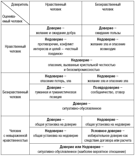 Попытка определить доверие как однозначное ожидание нравственного (справедливого, честного, ответственного) поведения, а недоверие как ожидание безнравственного поведения оказывается несостоятельной еще и по другой причине. Как показали результаты нашего эмпирического исследования, крайняя степень выраженности у оцениваемого человека некоторых нравственных качеств (гиперответственность, кристальная честность и т. д.) неоднозначно воспринимаются респондентами. Большинство считает эти характеристики важными основаниями доверия другому человеку. Но, по мнению части респондентов, такая бескомпромиссность и нечувствительность к контексту может привести к неприятным последствиям, особенно со стороны близкого человека, и поэтому вызывает недоверие к нему. Например, кристально честный человек в нравственно неоднозначной ситуации может не сохранить чужую тайну и в результате оцениваться как «предатель». Неоднозначность связи нравственности с доверием и безнравственности с недоверием можно представить в виде схемы. В таблице 1 представлены виды отношений, которые могут возникать при различных сочетаниях степени нравственности и безнравственности оцениваемого человека и самого доверителя.