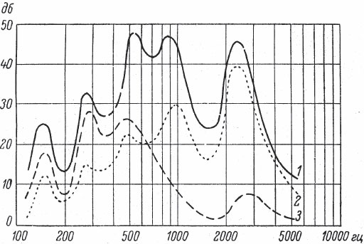 На рис. 4 представлено сопоставление спектров голоса (1) со спектром вибрации грудного (3) и головного (2) резонаторов. Хорошо видно, что спектр голоса певца как бы формируется объединением спектров грудного и головного резонаторов (по: Морозов, 1967).