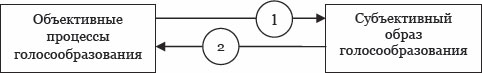 1 – прямой путь формирования субъективного образа голосообразования; 2 – обратный путь воздействия субъективного образа на объективный процесс голосообразования.