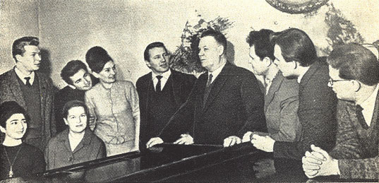 В. М. Луканин с учениками. Справа налево: Е. Нестеренко, С. Гаудасинский, А. Митрохин, В. Луканин, Г. Селезнев, С. Иванова, Э. Яновский и Ю. Григорьев, первая слева – Т. Барнабели, вторая – О. Слепнева, концертмейстер класса (фото В. П. Морозова, 60-е годы.).