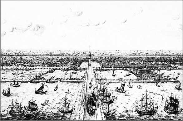Все строившееся на Котлине изначально должно было представлять собой сложный комплекс: крепость, защищавшая столицу, порт, обслуживающий морской и торговый флоты, и город. Голландский посланник Ван дер Гульт докладывал своему правительству: «Государь рассказывал нам свои предположения насчет постройки города на острове. Город этот будет населен только торговыми людьми, все строения предполагаются каменные. Город украсится набережными и мостами вроде Амстердамских. План так обширен, что на исполнение его потребуется много времени»[98]. Гюйссен, автор первого «Описания Санктпетербурга и Кроншлота», говоря о планах Петра вести всю коммерцию через Балтийское море, отмечал: «Он намерен также устроить в Кроншлоте и в С.-Петербурге […] значительное число подвальных кладовых и разных домов и пакгаузов, приспособленных для склада товаров»[99].