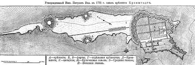 Петровский проект обороны Котлина Петр I утвердил в 1721 г. Главная идея проекта заключалась в том, что восточная часть острова была занята сильной крепостью с городом внутри нее и примыкающими к ней с юга гаванями. В непосредственной близости к ним располагались форты «Новый Кроншлот» и «Цитадель». На восток, на котлинскую косу, вынесли небольшую, но сильную крепостицу из пяти бастионных фронтов, перекрывающих узкий перешеек на косе. Еще две небольшие, но хорошо укрепленные крепостицы предполагалось разместить одну на северном берегу острова, другую – на южном. В дальнейшем этот проект претерпел некоторые изменения, но в целом сохранился.