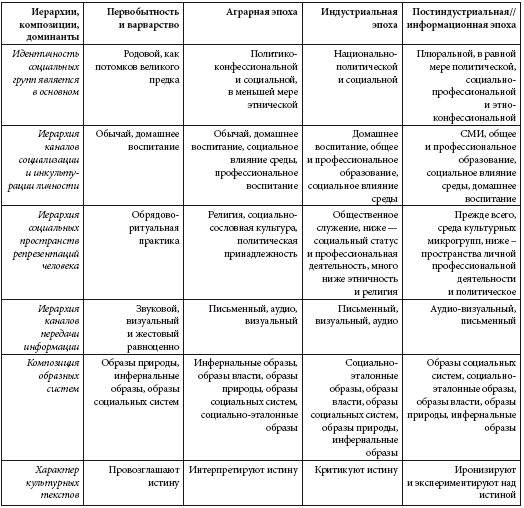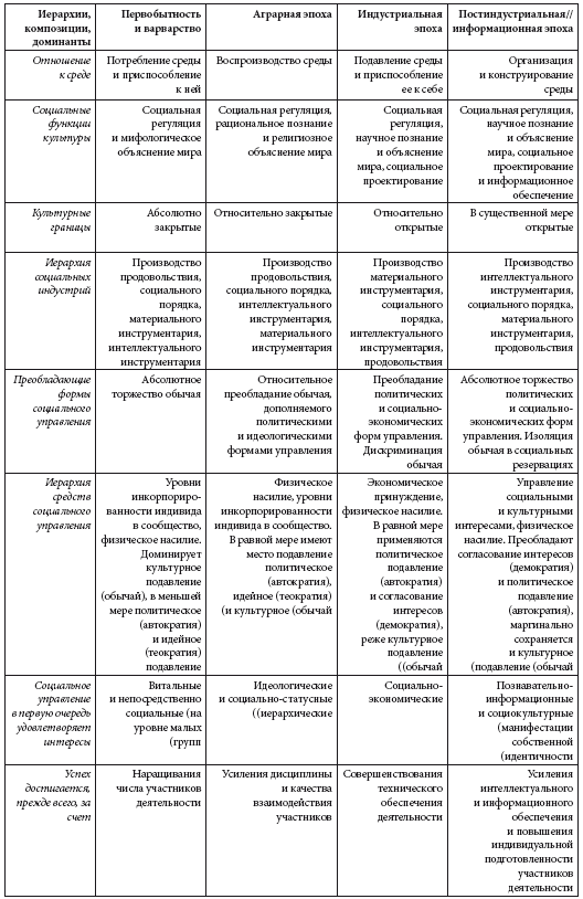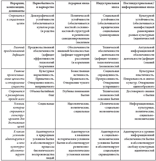 Этими двумя базовыми параметрами в большой мере определяется и большинство иных характеристик, рассматриваемых в проблемной группе «целевые и функциональные приоритеты культуры». В частности, показательна эволюция основных провозглашаемых ценностей и отвергаемых сущностей, а также вопрос о том, к расширению каких своих свойств и возможностей та или иная эпохальная культура стремится. Для первобытной культуры основная ценность – это культурная нормативность: отвергается новое, ненормативное; культура стремится в идеале к расширению объема витальных благ для людей собственной общины. Аграрная культура провозглашает своей главной ценностью божественную истинность, отвергает чужое (по-иному культурно закодированное) и стремится к расширению глубины понимания Бытия, познанию истины. Для индустриальной культуры главные ценности – социальная справедливость и прогресс, предмет отторжения – устаревшее, потерявшее актуальность; она стремится к всемерному расширению эффективности технического обеспечения деятельности. Постиндустриальная культура провозглашает главными ценностями культурную пластичность и плюральность, отвергает навязанное единообразие и стремится к расширению масштабов достоверного знания о Бытии, не к умозрительной истине, а к прагматически применимому знанию [441].