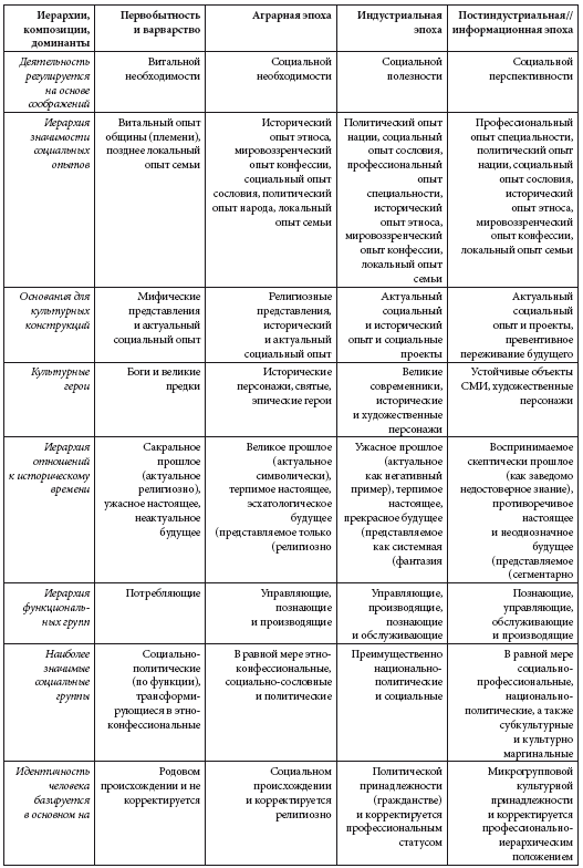 Для аграрной культуры характерна иная композиция. Иерархия социальной значимости опыта выстраивалась таким образом, что на первом месте, безусловно, был исторический опыт этноса, затем по убыванию значимости шли мировоззренческий опыт конфессии, социальный опыт сословия, политический опыт государства. В числе оснований для культурных конструкций приоритетными были религиозные представления и, разумеется, актуальный социальный опыт [694]. Культурными героями были, прежде всего, святые, эпические персонажи, а также великие исторические деятели, сказания и легенды о которых были широко распространены [698]. Отношение к историческому времени не очень отличалось от первобытного. Прошлое было великим, в нем жили и творили великие герои; настоящее – плохим, но терпимым; а будущее мыслилось только в эсхатологическом ключе – в форме окончательной победы добра над злом. Земное социальное будущее человечества фактически не осмысливались, возможно, как малозначимое на общем эсхатологическом фоне [54].