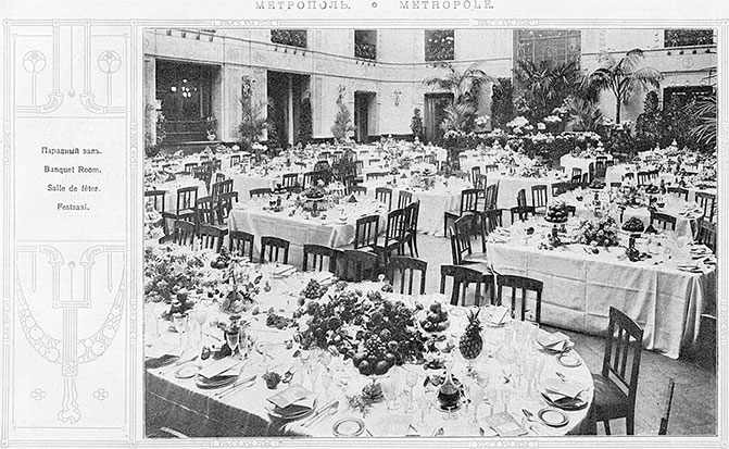 Открывшийся в «Метрополе» ещё в 1906 году первый в Москве двухзальный кинотеатр (он назывался «Театр Модерн») был поставлен на службу революции. Прославленный ресторан под стеклянным куполом тоже переоборудовали. Теперь в нём по вечерам происходили митинги, на которых нередко выступали Ленин или Троцкий, а днём он превращался, говоря по-советски, в точку общепита.