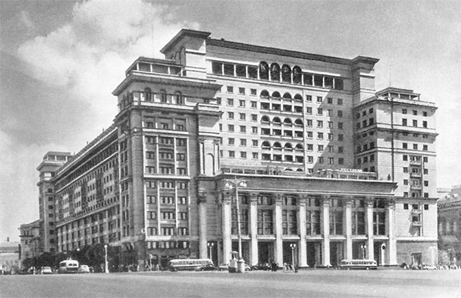Вместо нескольких снесённых кварталов Охотного Ряда здесь мог бы возникнуть Дворец Труда, но в процессе реконструкции планы поменялись. Решено было построить гостиницу для регулярно приезжавших в столицу депутатов Верховного Совета. Здесь, рядом с Кремлём и Благородным собранием (Дом союзов), ещё с дореволюционных времён располагалось несколько гостиниц, причём весьма высокого уровня, – но в случае с «гостиницей Моссовета» требовалось создать нечто особенное.