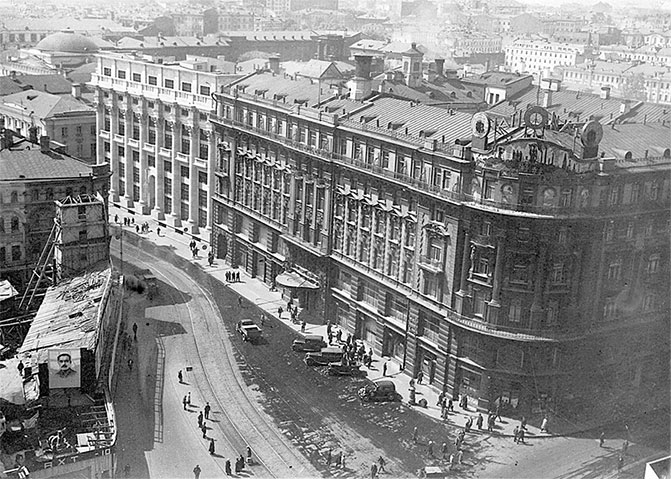 Вид с крыши гостиницы «Москва» на «Националь» и дом Жолтовского. Фото 1936 года из фонда ЦИГИ