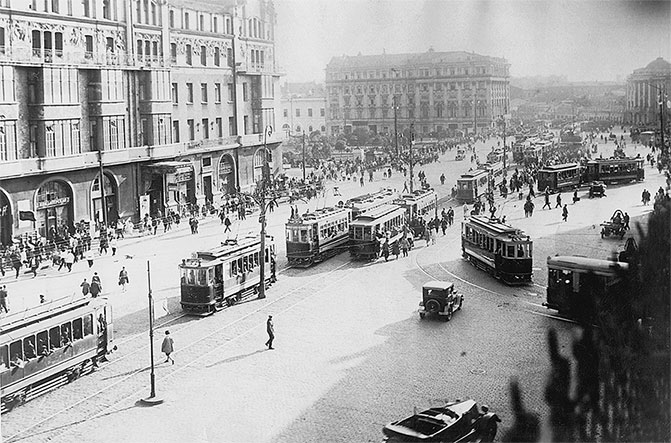 Но таковы уж, видимо, особенности национального градостроения – не то чтобы бессмысленные и беспощадные, но суровые. В 1930-х годах тоже никто ни с чем особо не церемонился. На снимке (с. 81) – место, где будет построена «Москва», и очень немногое из запечатлённого дошло до наших дней. Только Малый театр, ну и Большой, конечно, да ещё «Метрополь» и аптека Феррейна (тёмное здание с готической башенкой на правом краю кадра).