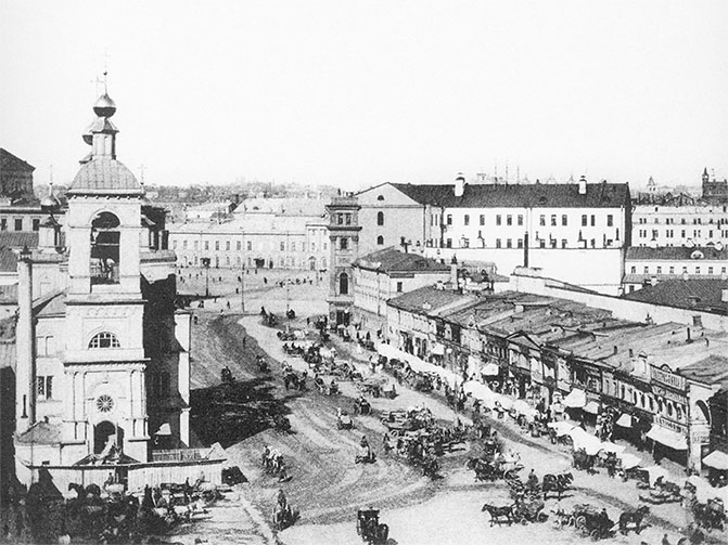Вид на Охотный ряд и церковь Параскевы Пятницы с угла Тверской. Фототипия «Шерер, Набгольц и Ко», 1900-е годы