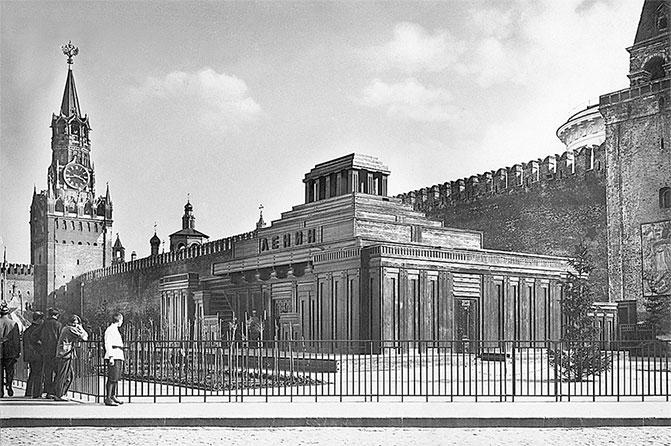 Первый мавзолей был временным; принято считать, что академик архитектуры Алексей Щусев спроектировал и построил его за три дня. Учитывая то состояние, в котором вождь революции пребывал в последний год жизни, не верится, что смерть его могла стать неожиданностью для кого бы то ни было, и уж тем более для товарища Сталина. Вполне вероятно, что преемник заблаговременно поставил задачу архитектору, и тот успел всё обдумать.